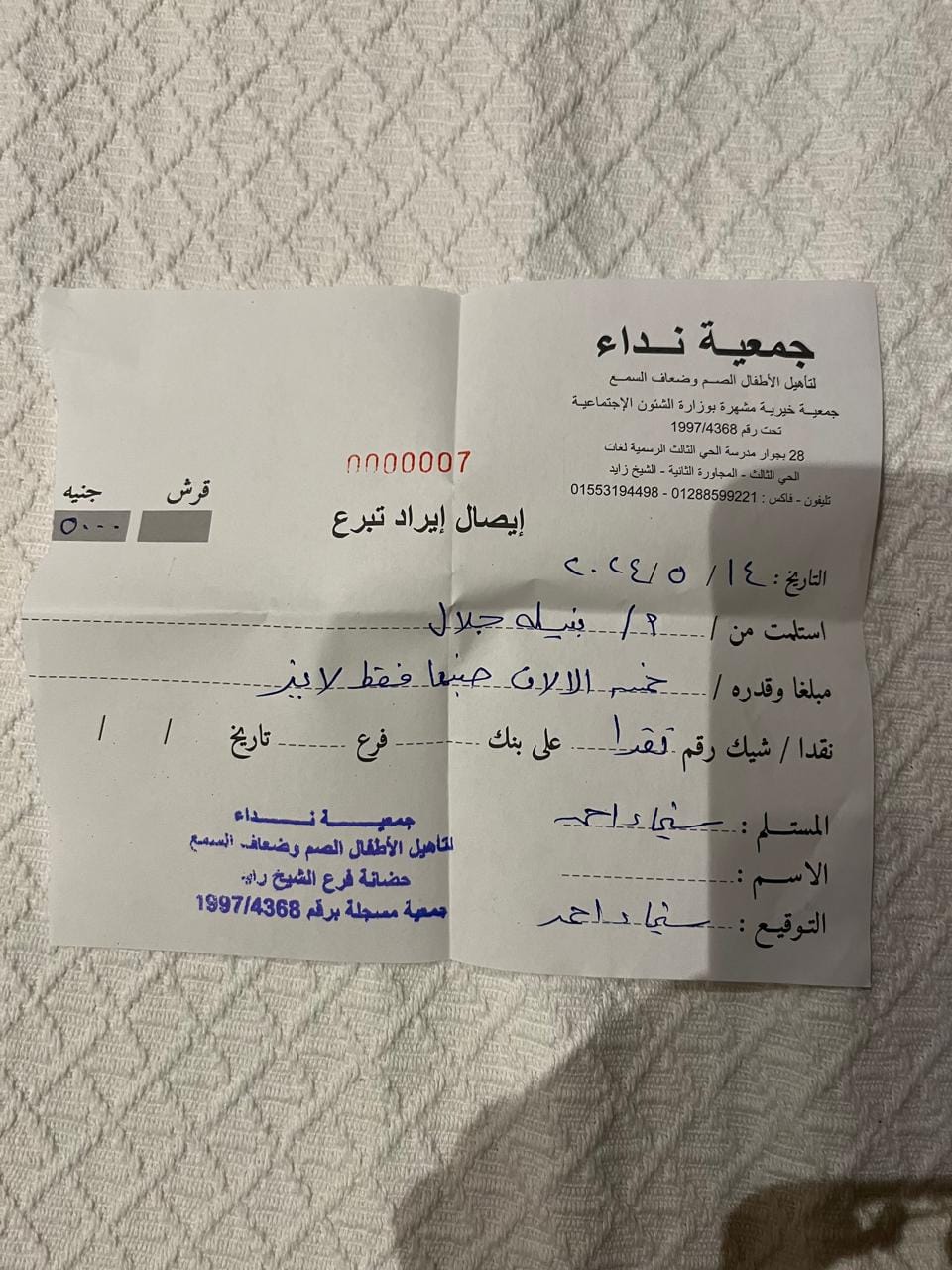 Egyptian pounds (5,000 EGP) to the Nidaa Association. Consequently, the