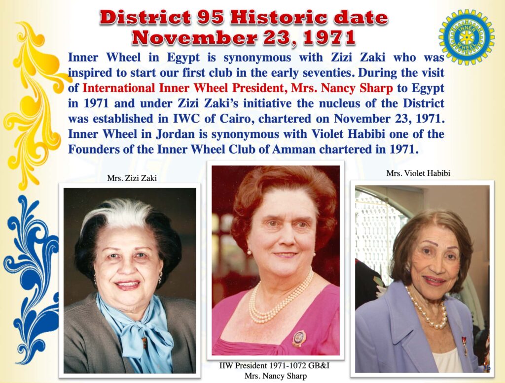 Inner Wheel in District 95 is synonymous with Zizi Zaki who was inspired to form the first Inner Wheel Club in Egypt in the early seventies.