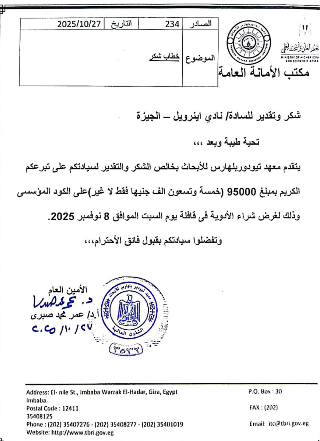 EGP 95,000 to the Theodor Bilharz Research Institute on October 27th,