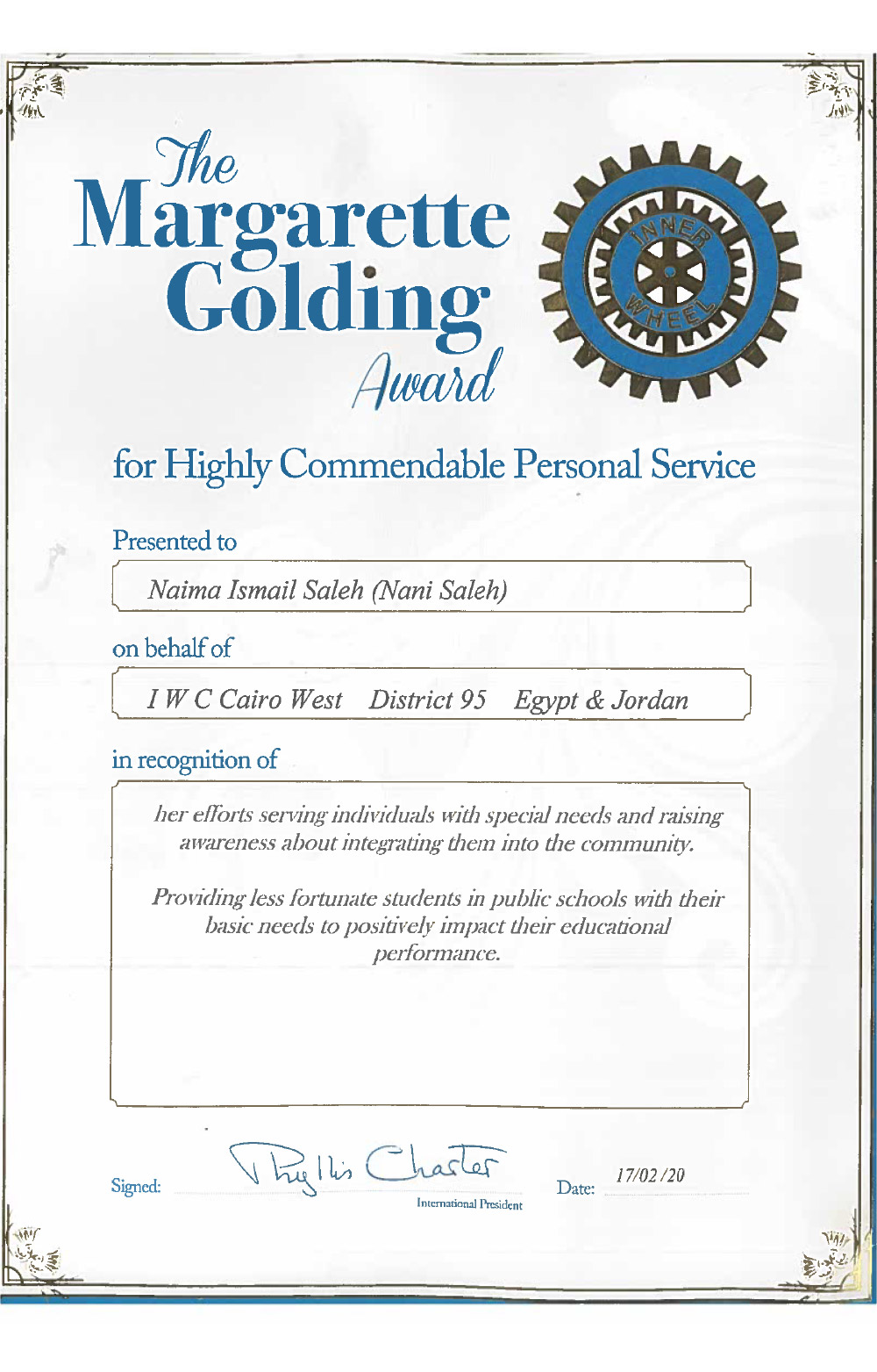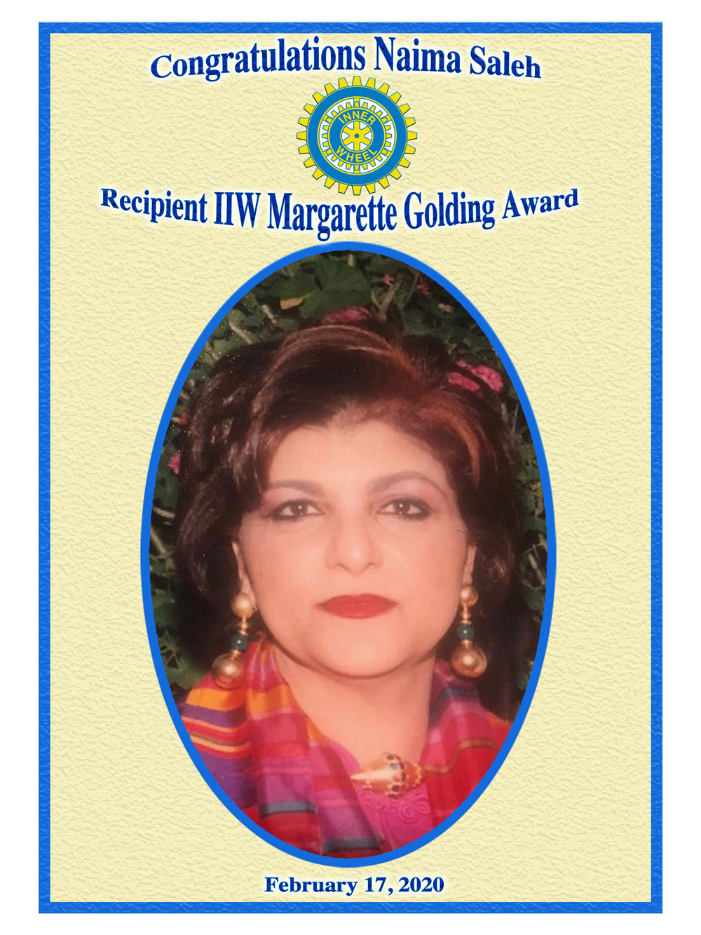 Mrs. Naima Saleh, founding member of IWC of Cairo West, chartered in 1980